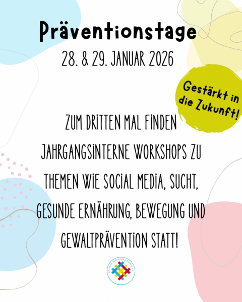 Im Rahmen unserer jährlich stattfindenden Präventionstage setzen sich alle Jahrgänge intensiv mit wichtigen Lebensthemen auseinander. In Workshops zu Social Media 🤳, Sucht 🚭, Gesundheit und Bewegung 🍀🍎, Gewalt 🥊 sowie psychischer Gesundheit 🧘🏼♀️stärken die Schülerinnen und Schüler ihre Selbstkompetenz und ihr Verantwortungsbewusstsein. Gemeinsam fördern wir Aufklärung, Austausch und einen achtsamen Umgang mit sich selbst und anderen.